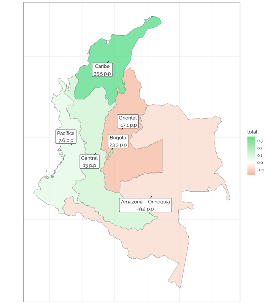 The average differences for Bogota and the Pacific region are also positive, with an increase in average investment of 43 p.p. for Bogota and 14.7 p.p. for Pacific with respect to non-certified companies in these regions. On the other hand, the Eastern region has a negative difference of 33.2 percentage points, indicating a higher average investment by non-certified establishments. The differences in the Caribbean and Central regions are minimal and may not be significant.
